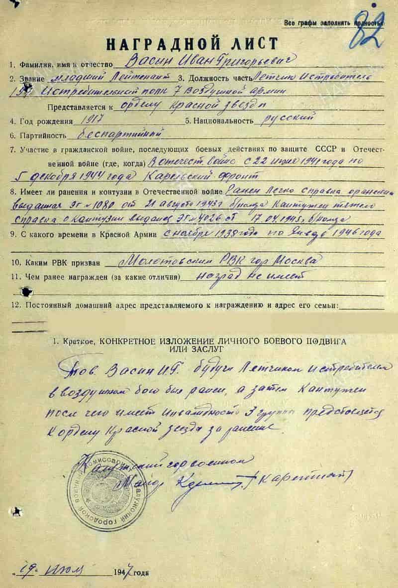 19.07.1947 младший лейтенант Васин И.Г. Горвоенкоматом г. Калуги представлен к награде.
