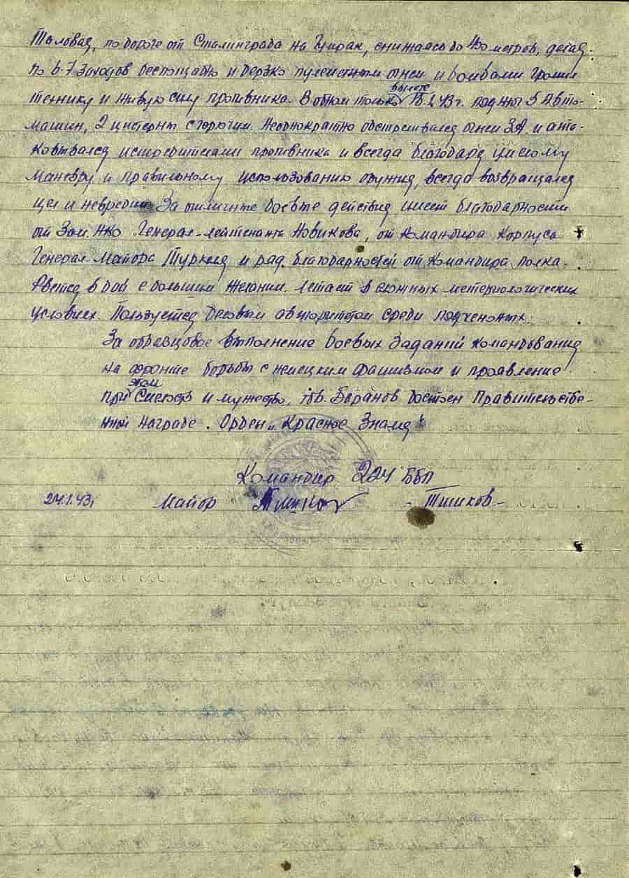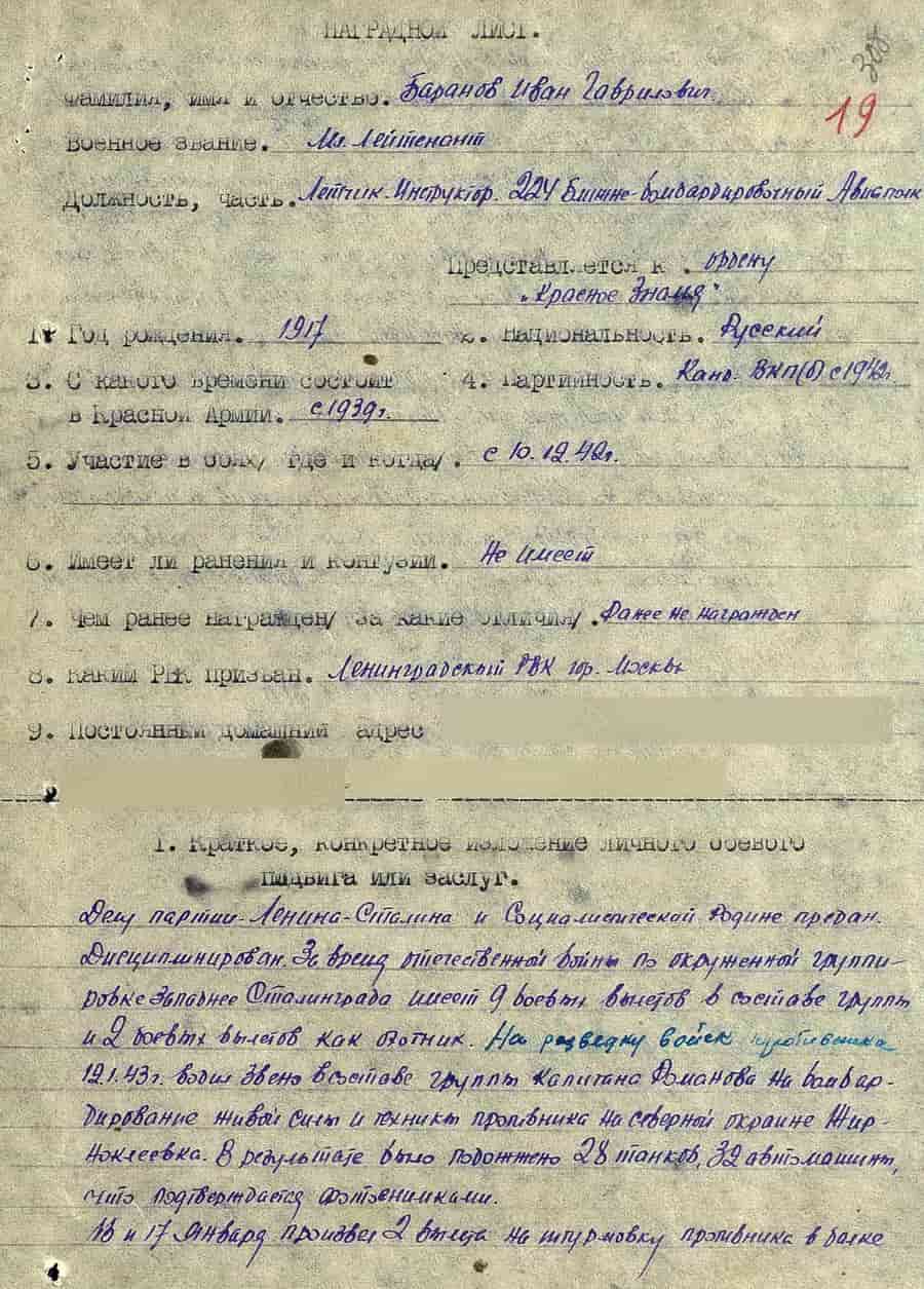 24.01.1943 лётчик-инструктор 224 ббап младший лейтенант Баранов И.Г. представлен к награде.