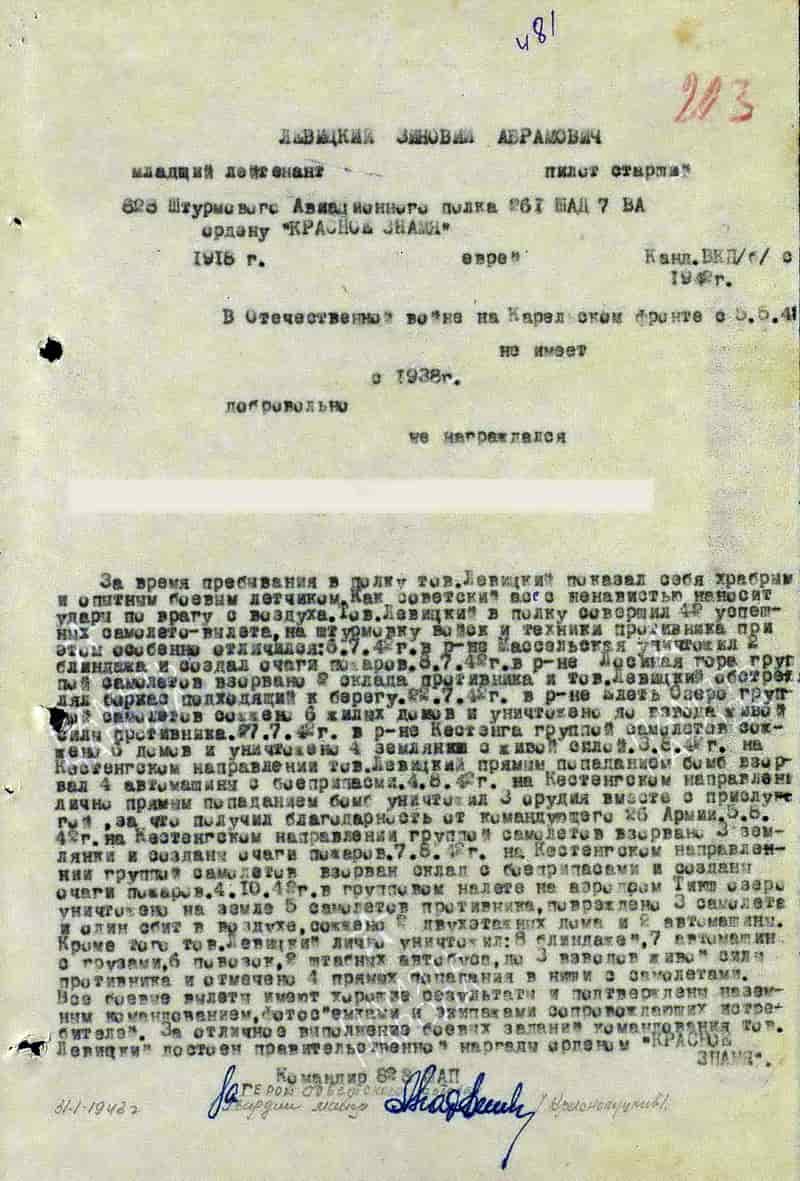 31.01.1943 пилот старший 828-го шап 261 шад 7-й ВА Карельского фронта младший лейтенант Левицкий З.А. представлен к награде.