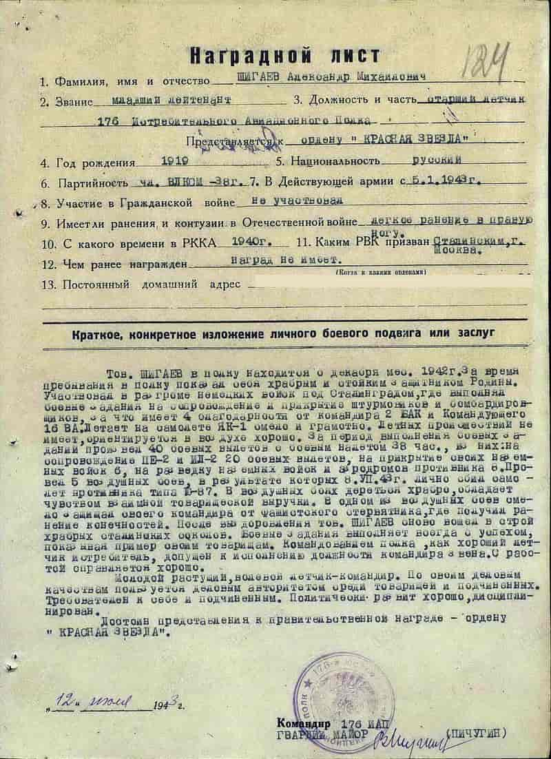 12.07.1943 старший лётчик 176 иап 283 иад 16-й ВА Центрального фронта младший лейтенант Шигаев А.М. представлен к ордену Красной Звезды и 13.07.1943 награждён медалью «За отвагу».