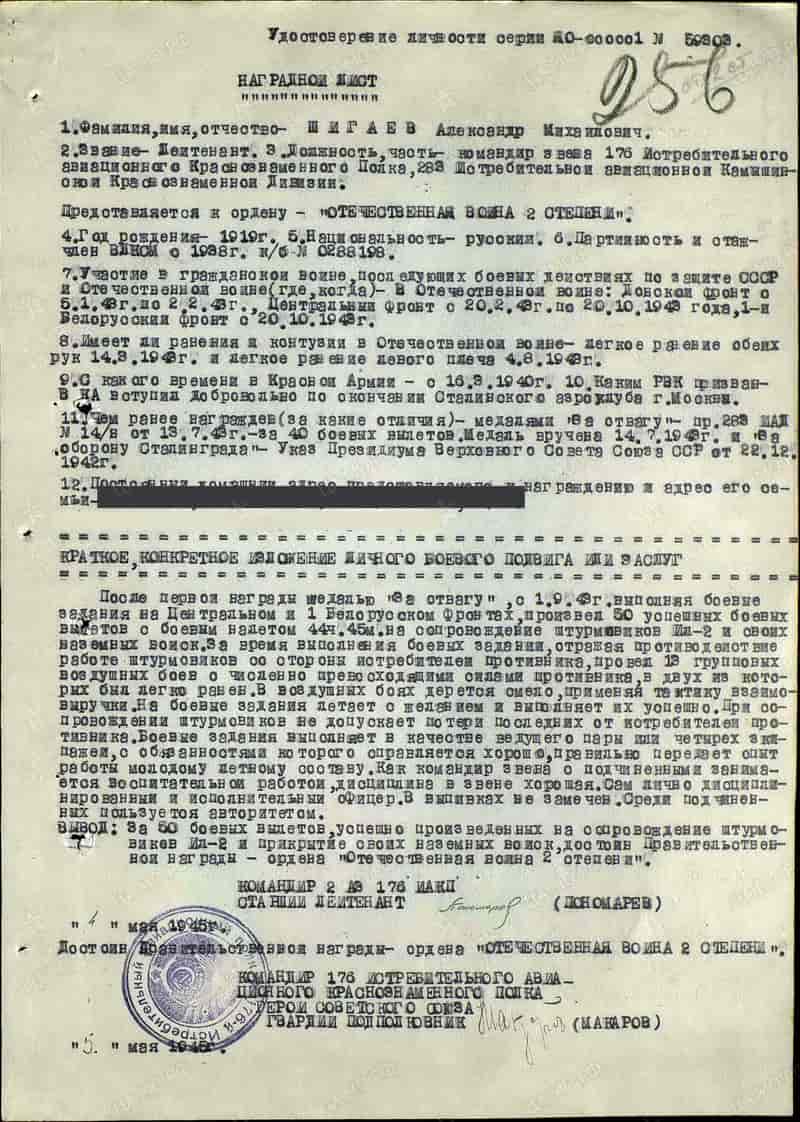 04.05.1945 командир звена 176 иап 283 иад 13 иак 16-й ВА 1-го Белорусского фронта лейтенант Шигаев А.М. представлен и 30.05.1945 награждён орденом Отечественной войны II степени.