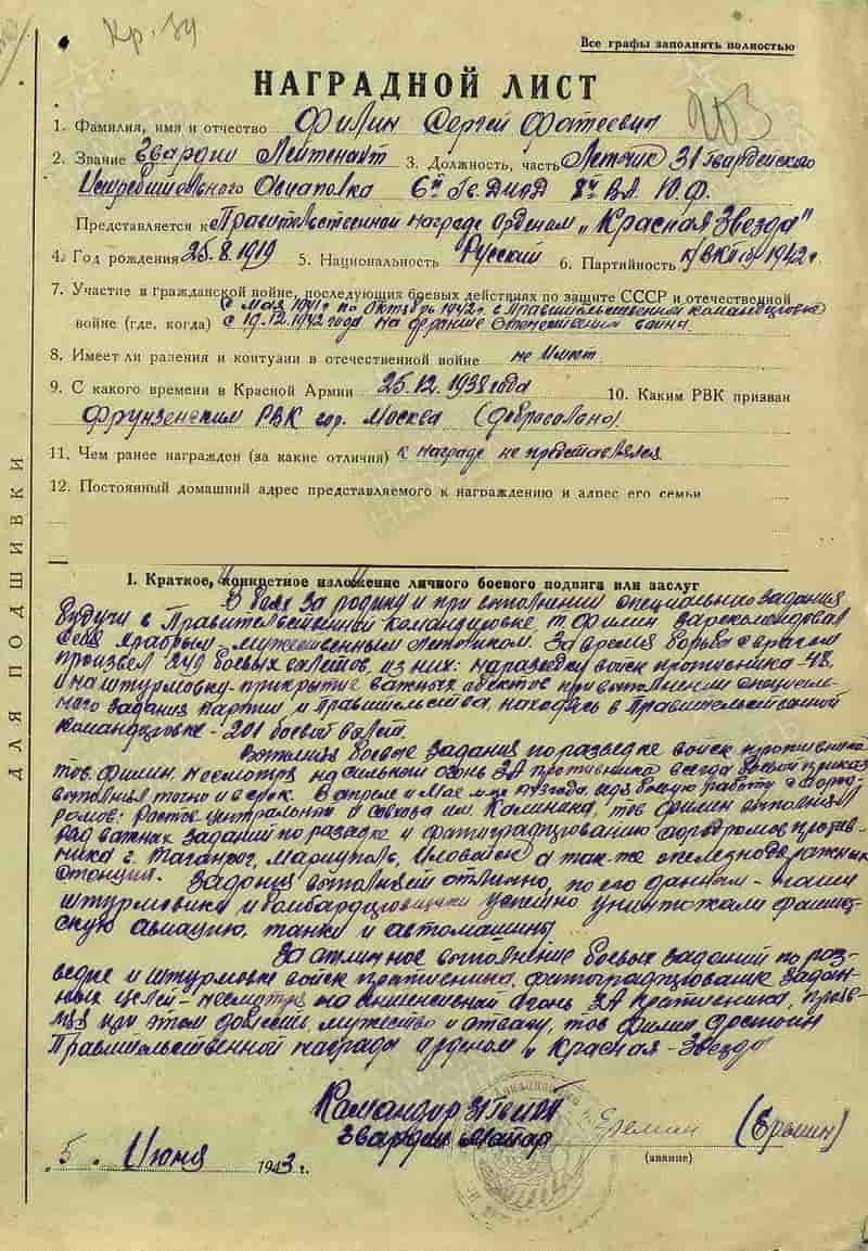 05.06.1943 лётчик 31 гиап 6 гиад 8-й ВА Южного фронта гвардии Филин С.Ф. представлен к награде.