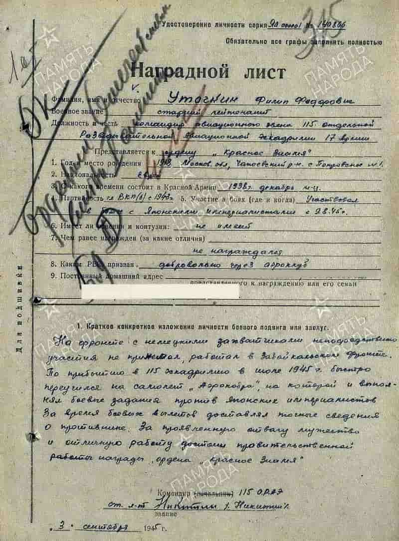 03.09.1945 командир звена 115-й ораэ старший лейтенант Уточкин Ф.Ф. представлен к награде.