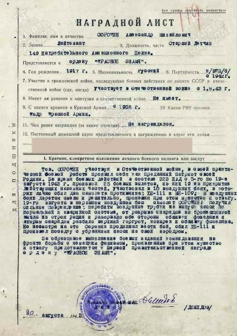 20.08.1943 лётчик старший 149 иап лейтенант Сорокин А.М. представлен к награде.