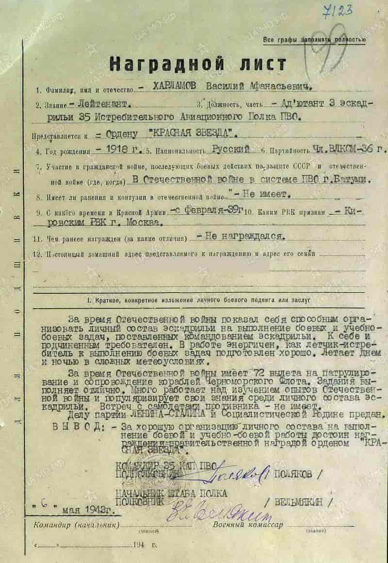 В УПК есть данные об окончания службы старшего лейтенанта Харламова В.А. в декабре 1943 года.