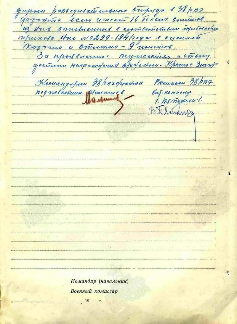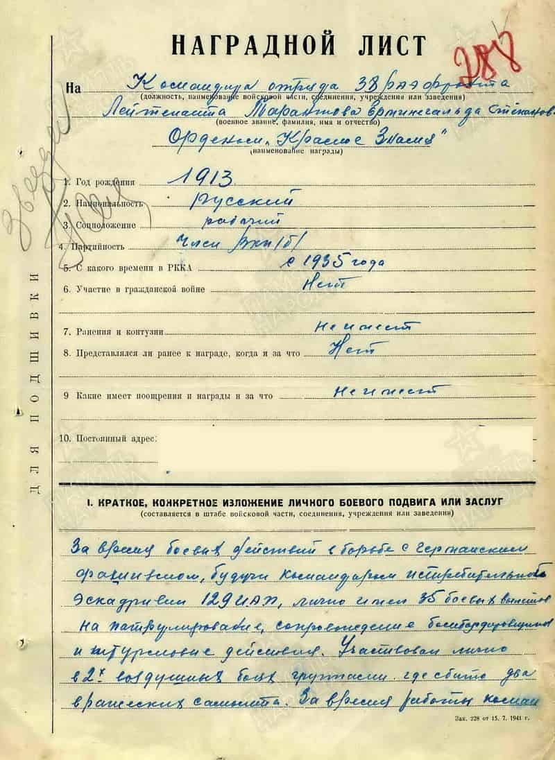 Осенью 1941 года командир отряда 38-й ораэ Западного фронта лейтенант Тарантов Е.С. представлен к награждению орденом Красного Знамени. 06.11.1941 посмертно награждён орденом Красной Звезды.