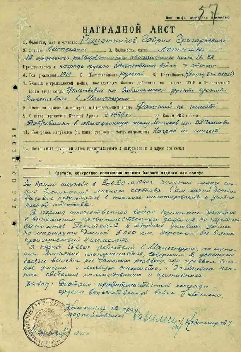 04.09.1945 лётчик 12-го орап лейтенант Решетников Г.Г. представлен к награде.