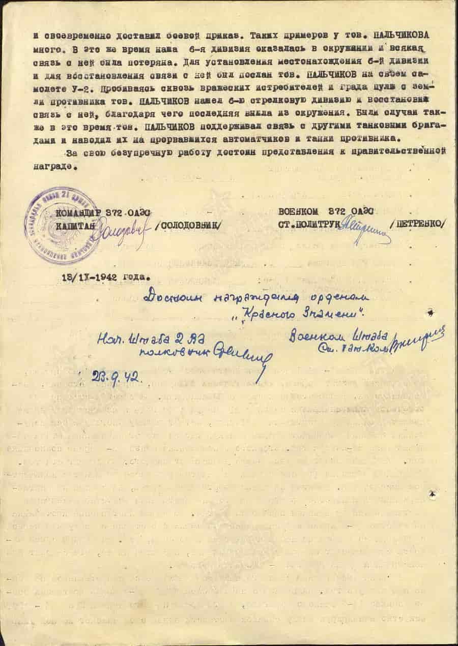 13.09.1942 пилот 372 отдельной авиационной эскадрильи связи 2-й ВА Воронежского фронта лейтенант Пальчиков А.А. представлен к награде.
