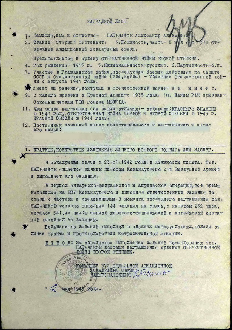 12.05.1945 пилот 372 отдельной авиационной эскадрильи связи старший лейтенант Пальчиков А.А., личный пилот командующего 2-й ВА представлен к награде.