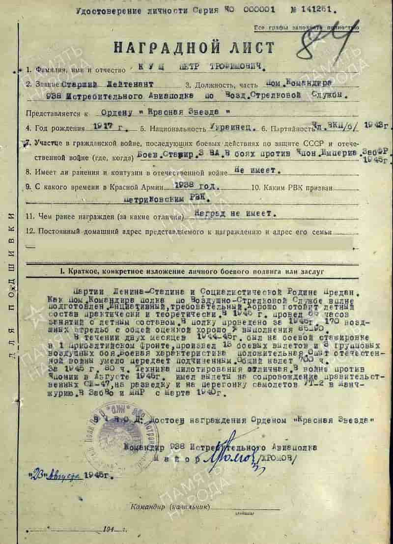 23.08.1945 помощник командира по воздушно-стрелковой службе 938 иап 297 иад 12-й ВА Забайкальского фронта старший лейтенант Кущ П.Т. представлен к награде.
