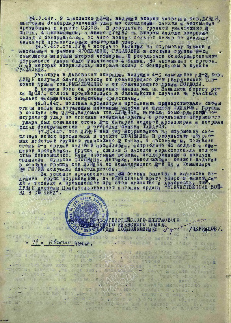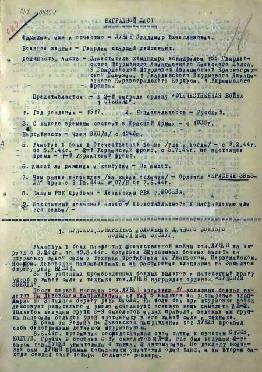 19.08.1944 заместитель командира эскадрильи 155 гшап гвардии старший лейтенант Лунин В.В. представлен к награде.