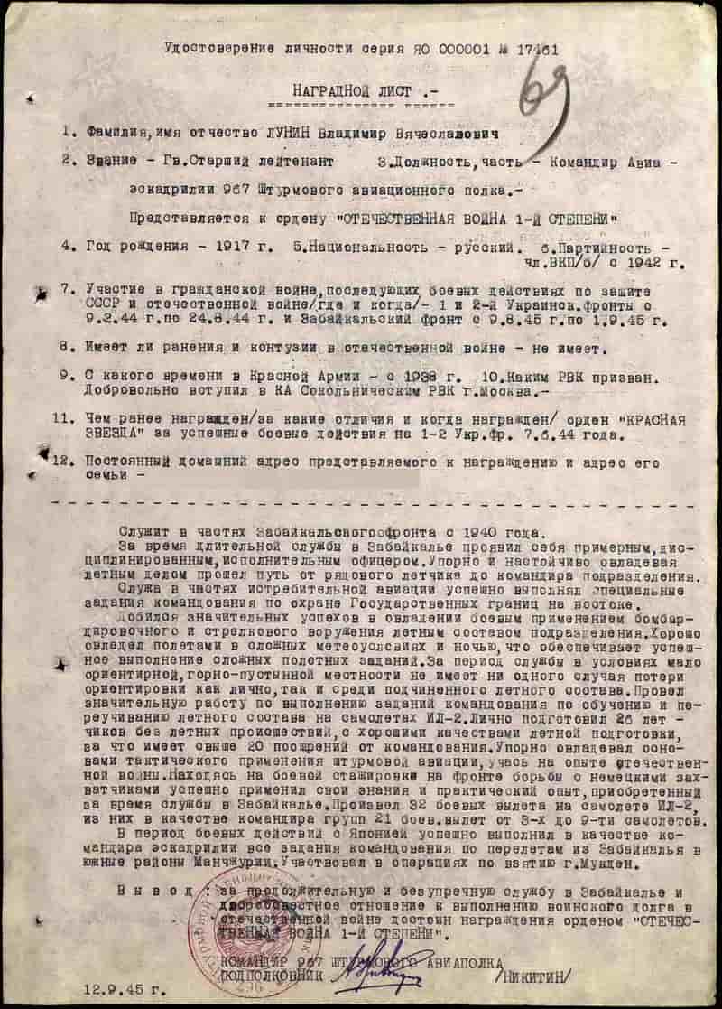 12.09.1945 командир эскадрильи 967 шап гвардии старший лейтенант Лунин В.В. представлен к награде.