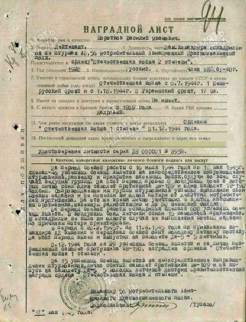 13.05.1945 заместитель командира, штурман эскадрильи 56 иап 194 иад 17 ВА лейтенант Коротков В.И. представлен к награде.