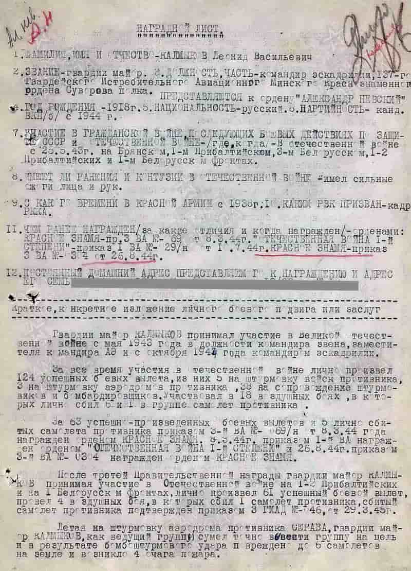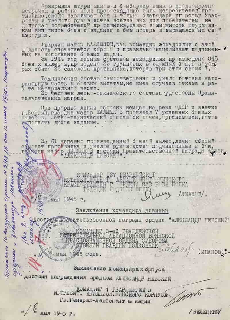 14.05.1945 командир эскадрильи 137 гиап 3 гиад 1 гиак 16-й ВА гвардии майор Калмыков Л.В. представлен к награде.