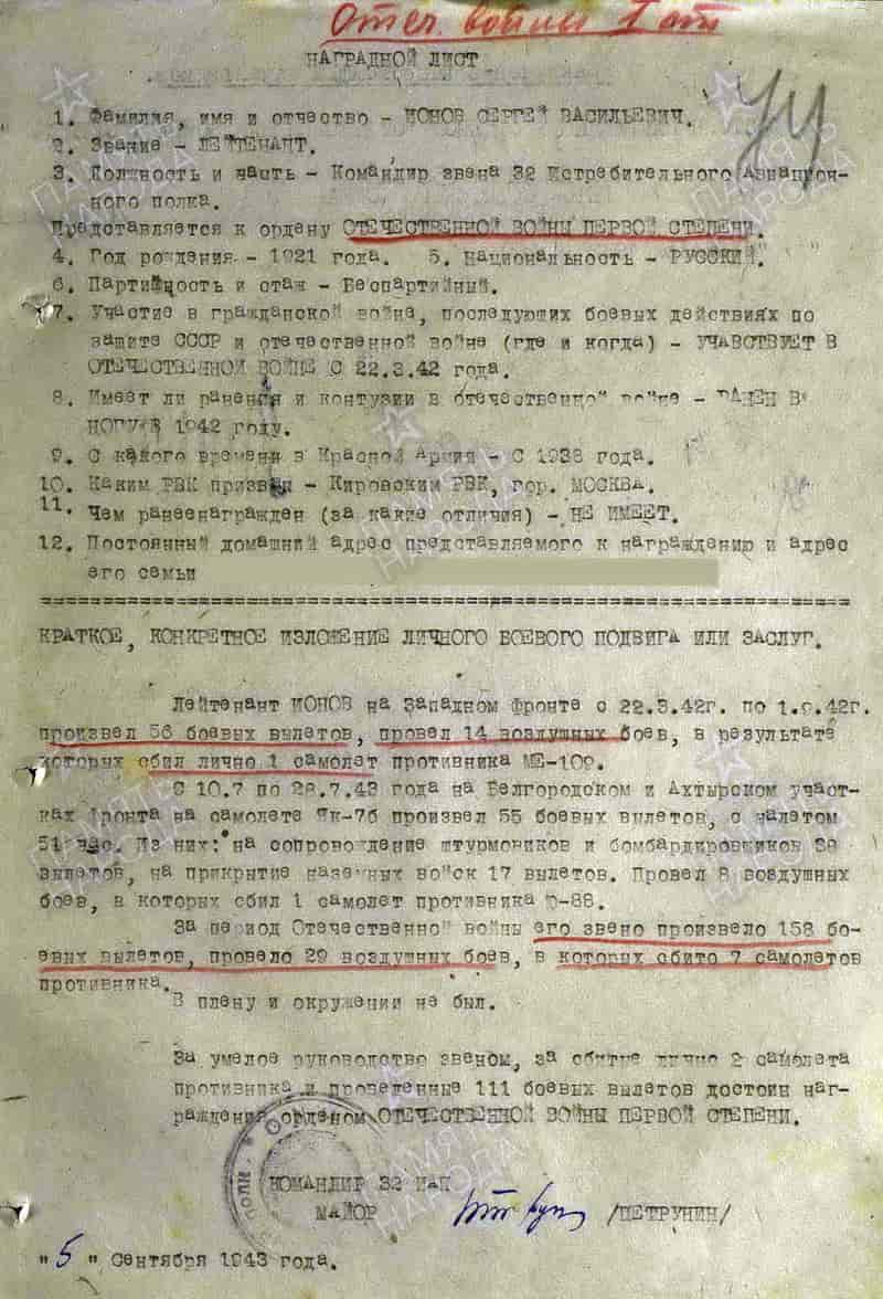05.09.1943 командир звена 32 иап лейтенант Ионов С.В. представлен к награде.