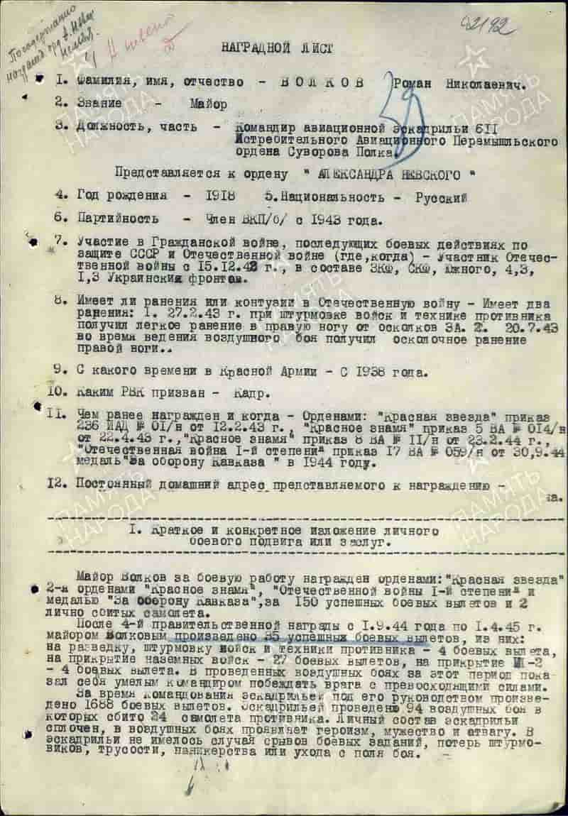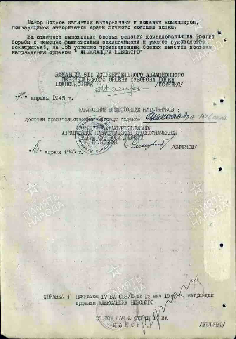 07.04.1945 командир эскадрильи 611 иап 288 иад 17-й ВА 3-го Украинского фронта майор Волков Р.Н. представлен к награде.