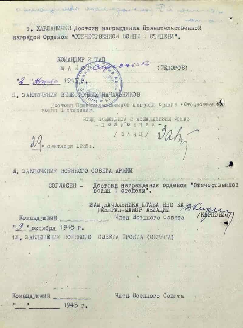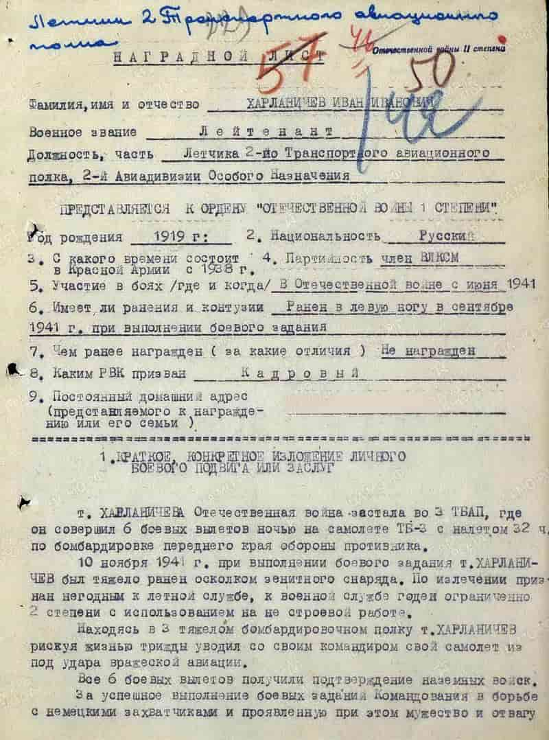 02.08.1945 лётчик 2-го транспортного авиационного полка 2-й авиадивизии особого назначения лейтенант Харланичев И.И. представлен к награде.