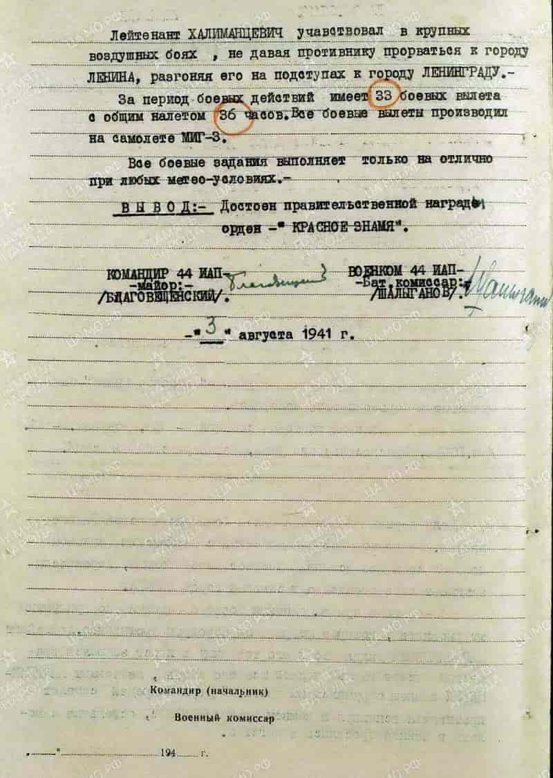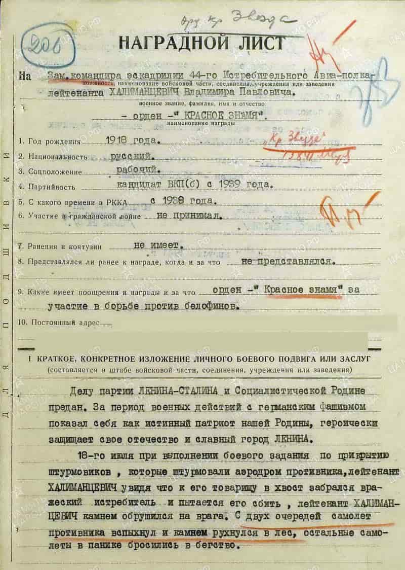 03.08.1941 заместитель командира эскадрильи 44 иап 7 иак ПВО Северного фронта лейтенант Халиманцевич В.П. представлен к ордену Красного Знамени (11.08.1941 командиром 7 иак к ордену Ленина) и 20.12.1941 награждён орденом Красной Звезды (посмертно).
