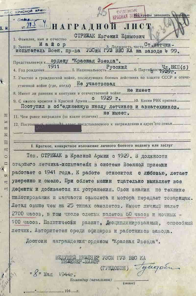 08.05.1944 старший лётчик-испытатель военной приёмки Управление заказов самолётов и моторов ГУЗ ВВС КА на авиазавода № 99 (г. Улан-Удэ) майор Стрижак Е.Е. представлен к награде.