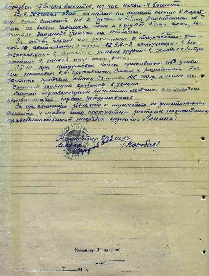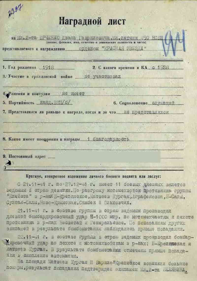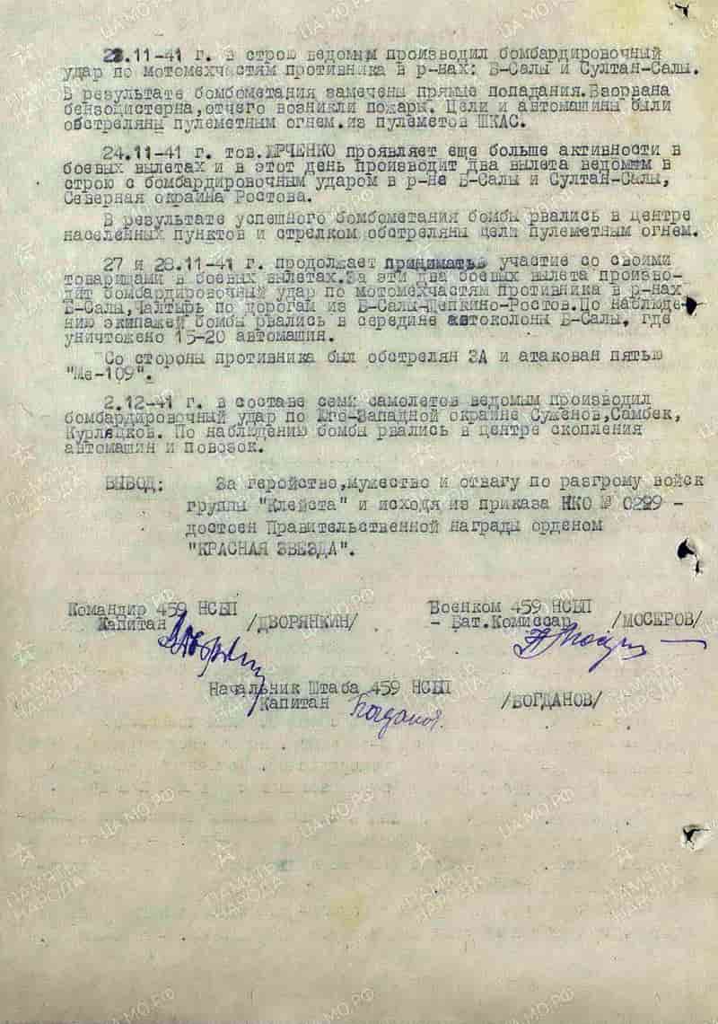 30.01.1942 младший летчик 459-го нсбап младший лейтенант Юрченко И.Г. представлен и 23.02.1942 награждён орденом Красной Звезды.