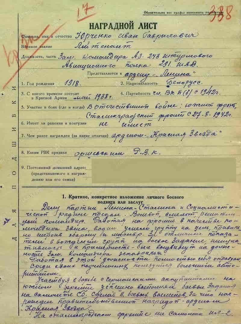 25.10.1942 заместитель командира эскадрильи 243 шап 291 шад 16-й ВА Сталинградского фронта лейтенант Юрченко И.Г. представлен к награждению орденом Ленина. 03.11.1942 награждён орденом Красного Знамени.
