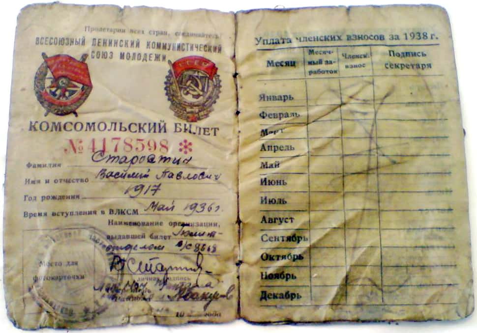 В 1937 году, когда Василию не исполнилось еще и 20-ти лет, его призвали на срочную военную службу. В том же году парень поступил в лётное училище города Вольска. В семейном архиве Владимира Николаевича Старостина бережно хранится фотография, сделанная в те годы. Курсант Василий Старостин стоит, позируя фотографу, облокотившись на этажерку. Ещё молодой, ещё живой… Василий с детства грезил о небе. Мечта, ставшая реальностью, отобрала у него жизнь, навеки оставив его 27-летним. В 1945 году его приемной матери Екатерине Филипповне Старостиной пришла похоронка, в которой скупо сообщалось, что старший лейтенант В.П. Старостин погиб при катастрофе 20.01.1945г.