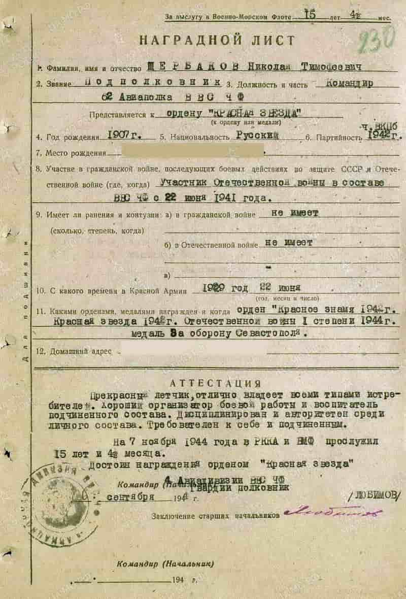 06.09.1944 командир 62-го иап 4-й авиадивизии ВВС Черноморского флота представлен к награде и 03.11.1944 награждён орденом Красной Звезды.