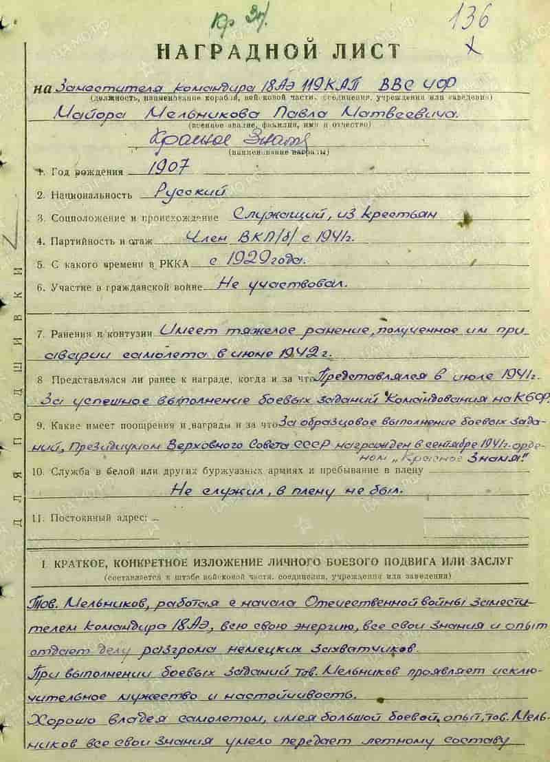 30.04.1943 заместитель командира 18-й омраэ 119 морского разведывательного авиационного полка ВВС ЧФ майор Мельников П.М. представлен и 18.06.1943 награждён орденом Красного Знамени.