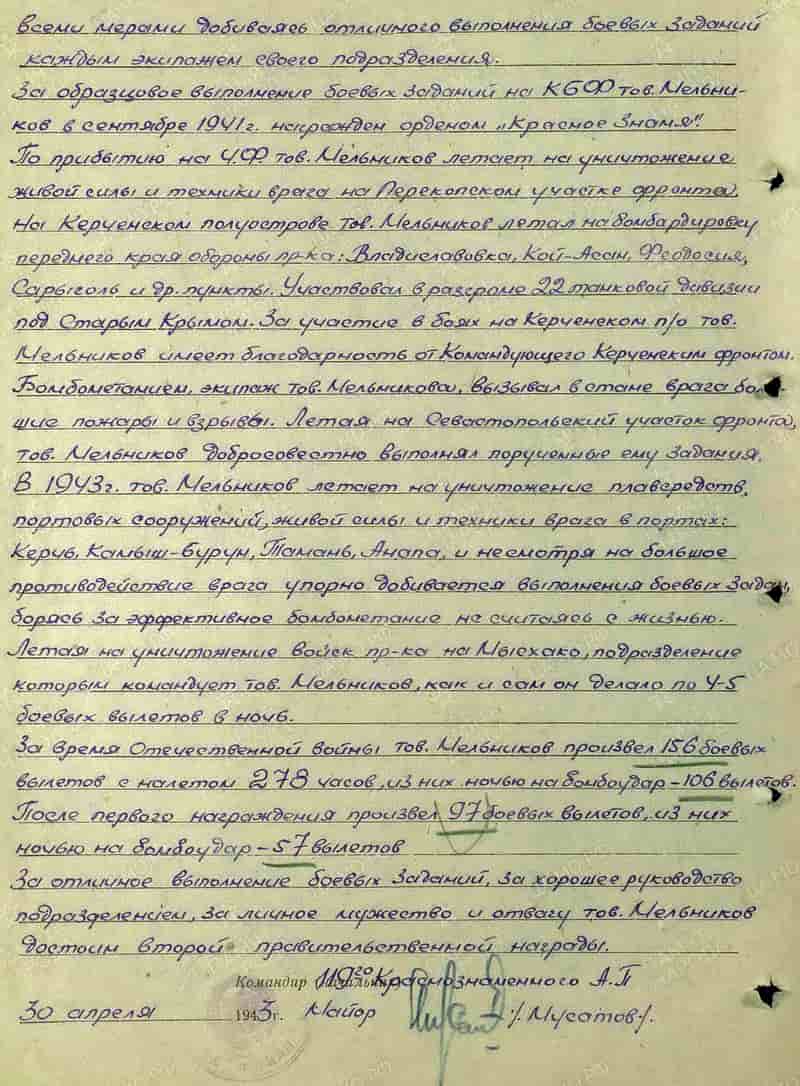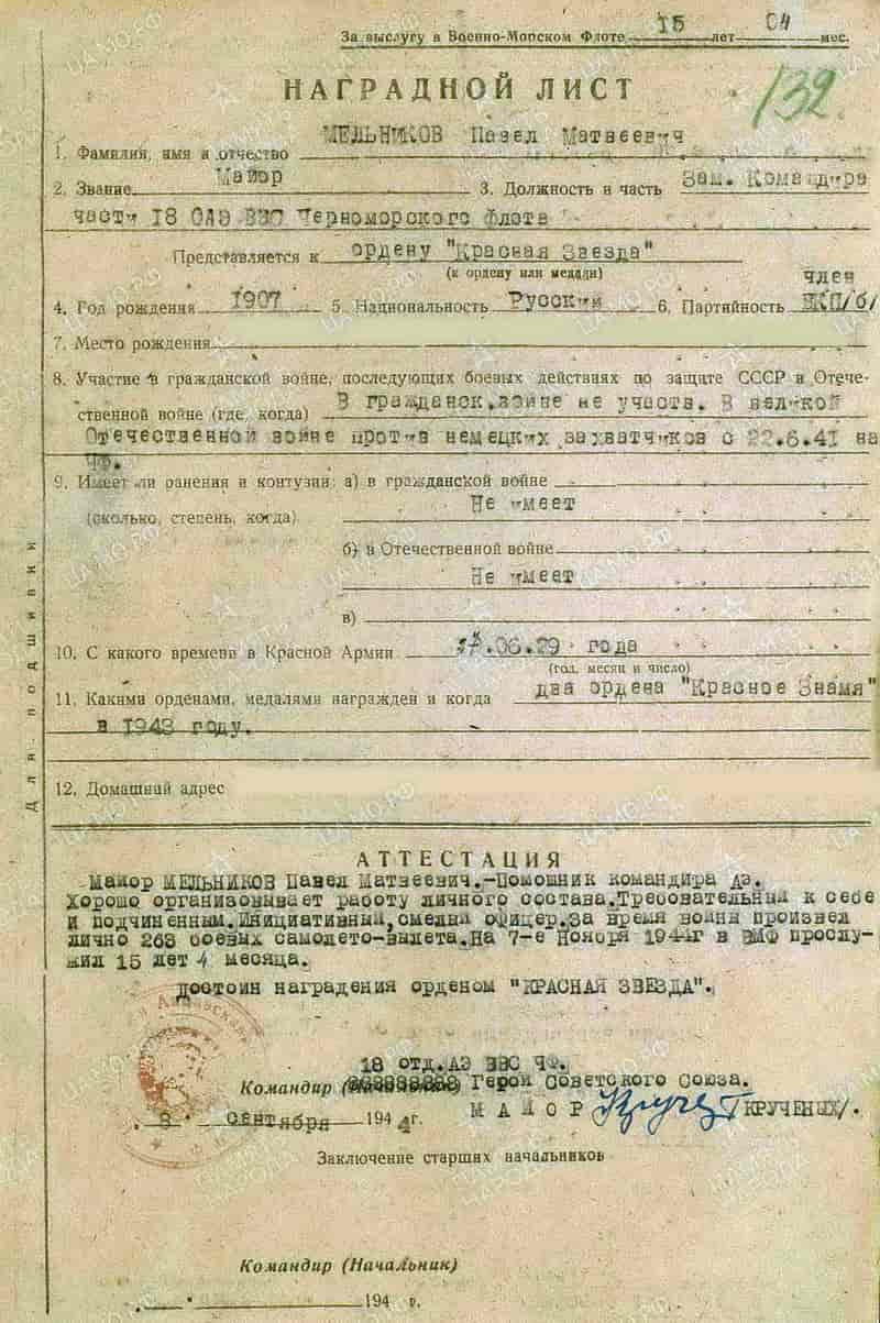 08.09.1944 заместитель командира 18-й отдельной мдраэ ВВС ЧФ майор Мельников П.М. представлен к награде.