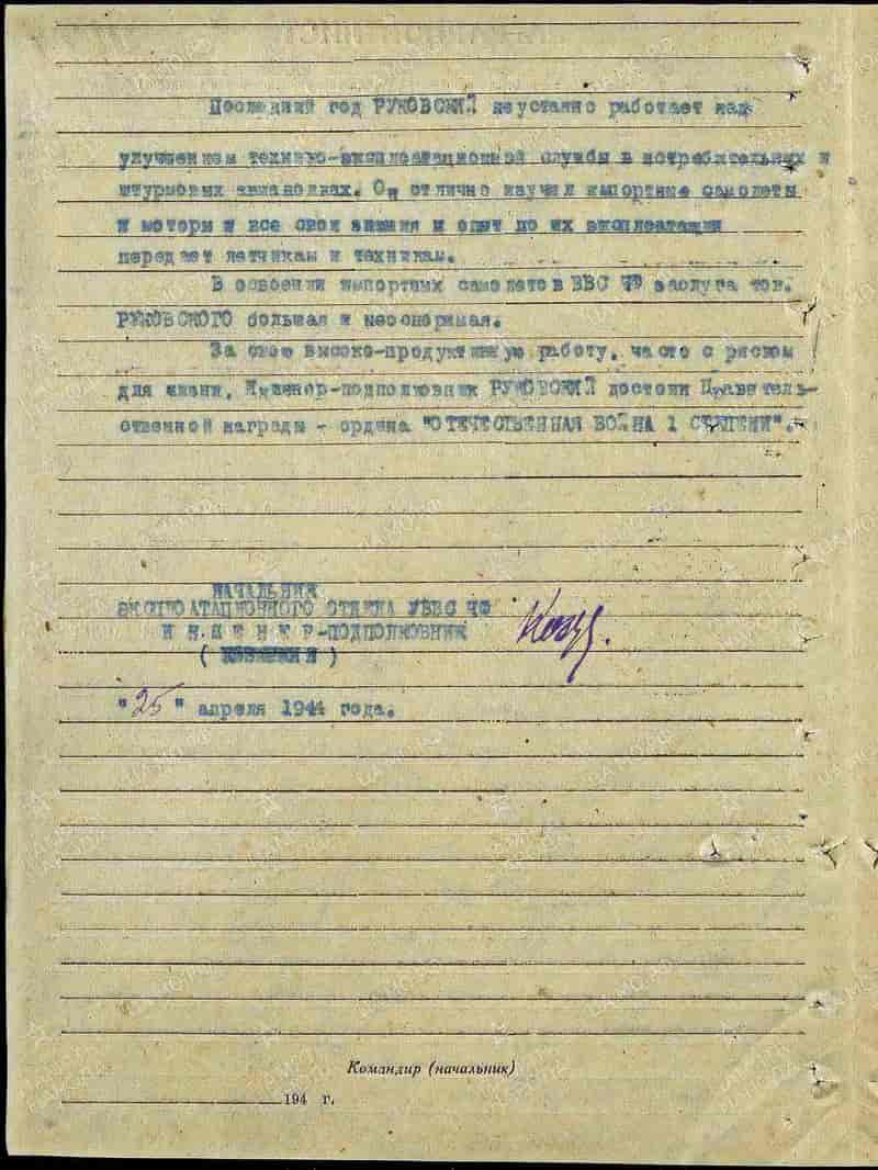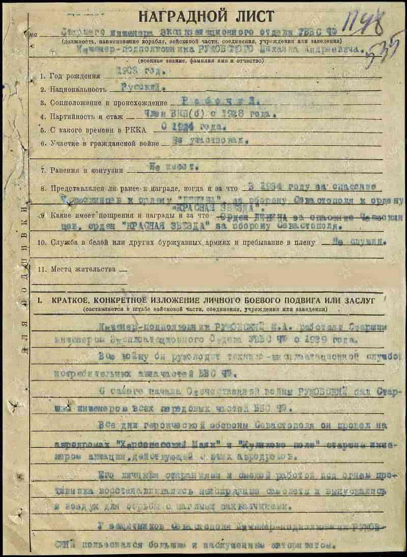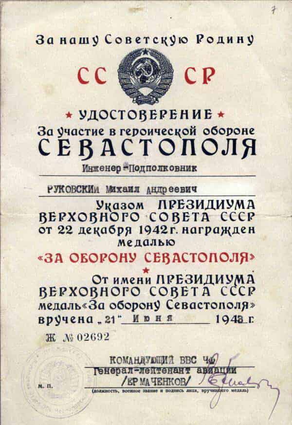 25.04.1944 старший инженер эксплуатационного отдела управления ВВС ЧФ инженер-подполковник Руковский М.А. представлен к награждению и 30.04.1944 награждён орденом Отечественной войны I степени.