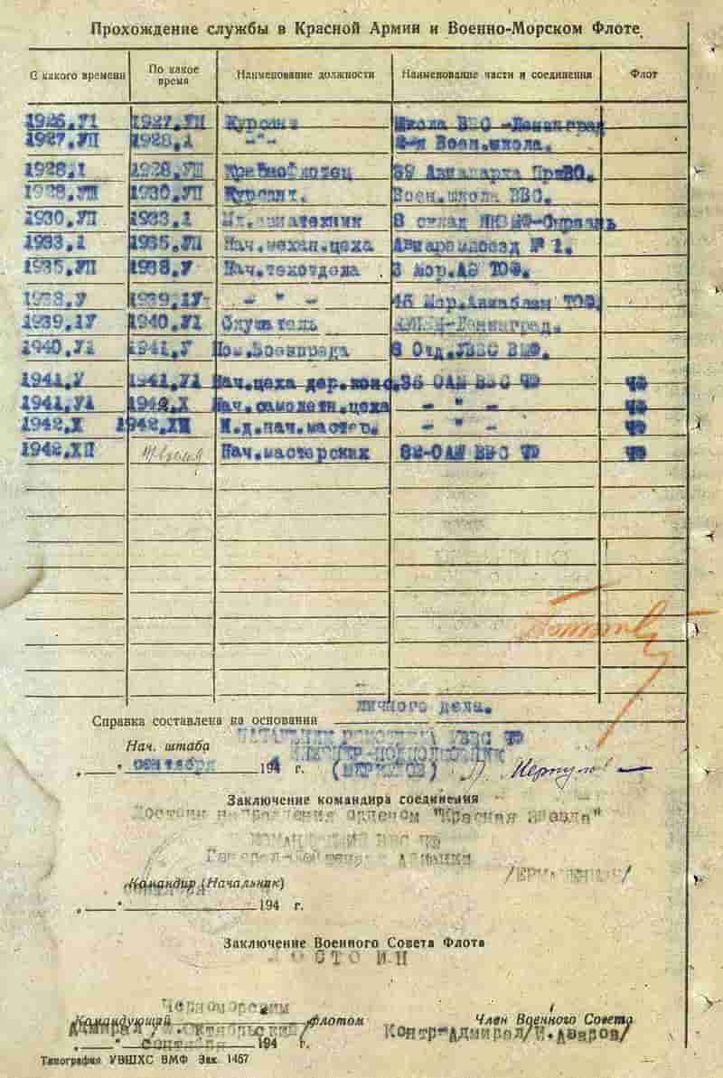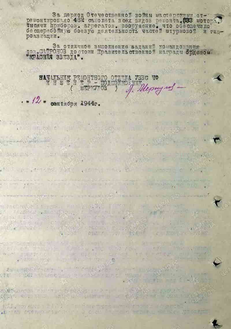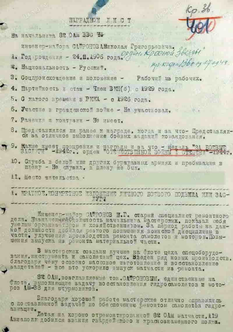 12.09.1944 начальник 82-й окружной авиационной мастерской ВВС ЧФ инженер-майор Сафронов Н.Г. представлен к награждению и 27.09.1944 награждён орденом Красной Звезды.
