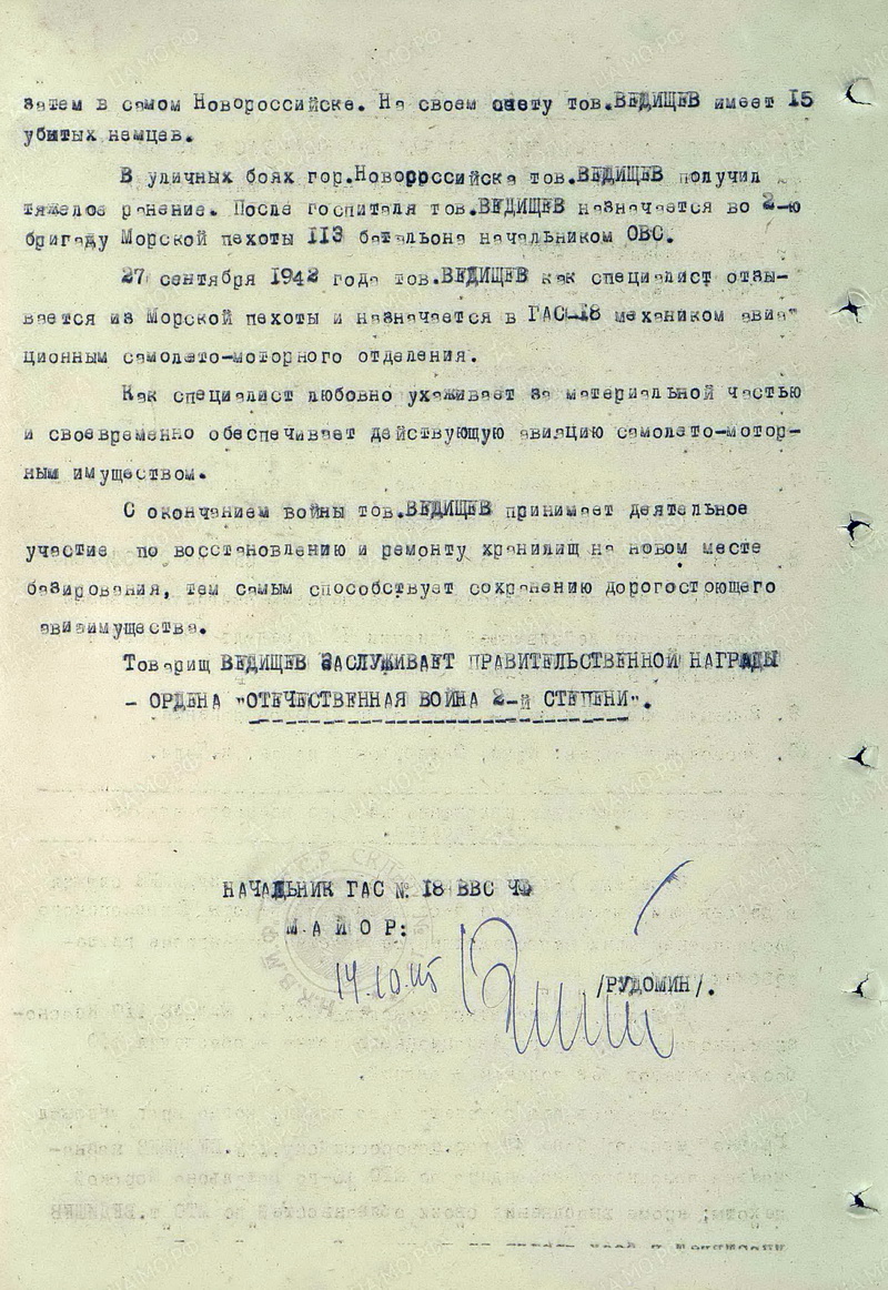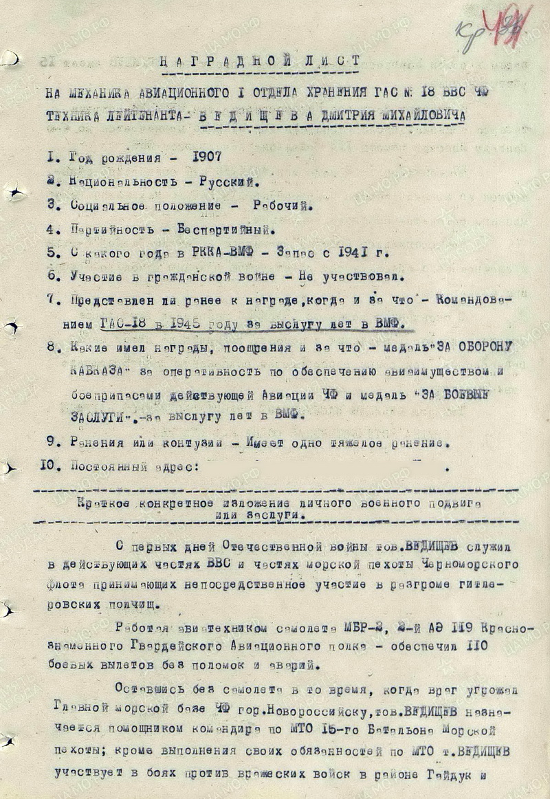 14.10.1945 механик авиационный 1-го отдела хранения ГАС № 18 ВВС Черноморского флота техник-лейтенант Ведищев Д.М. представлен к награде.