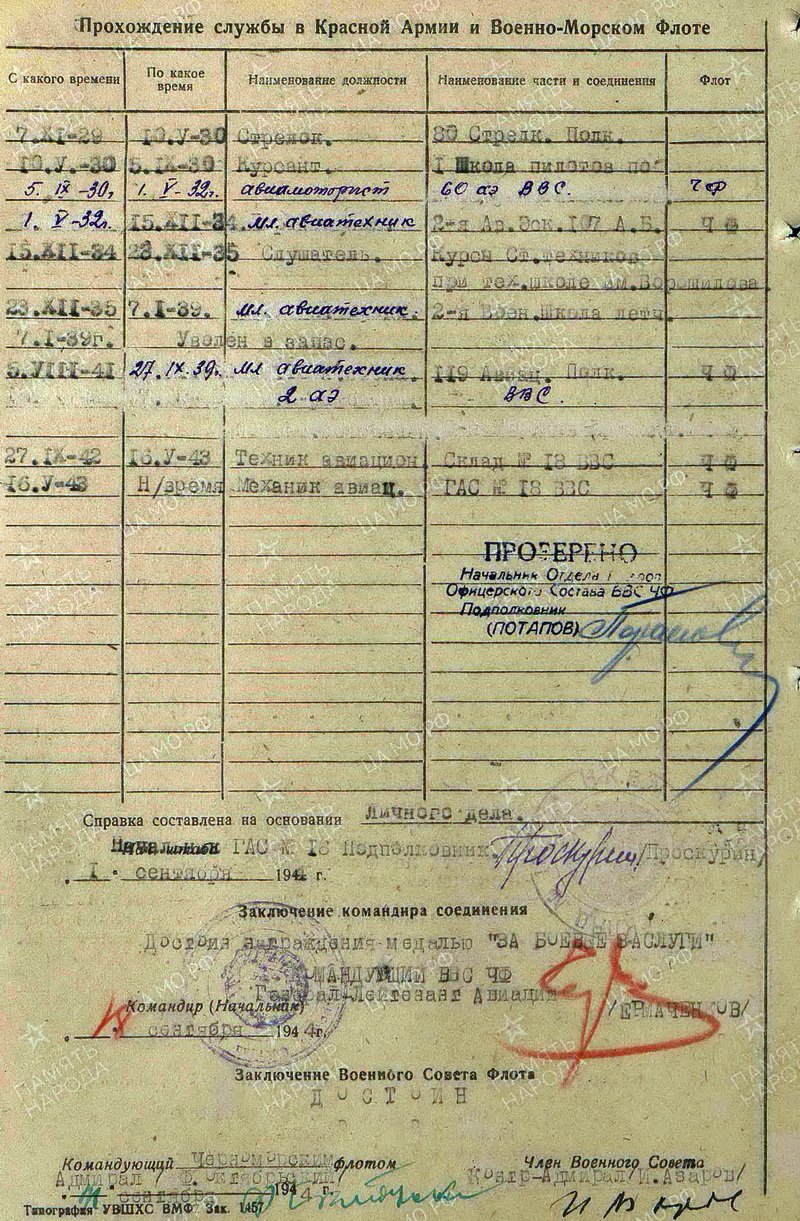 Служил младшим авиатехником во 2-й ВШЛ с декабря 1935 по январь 1939 года