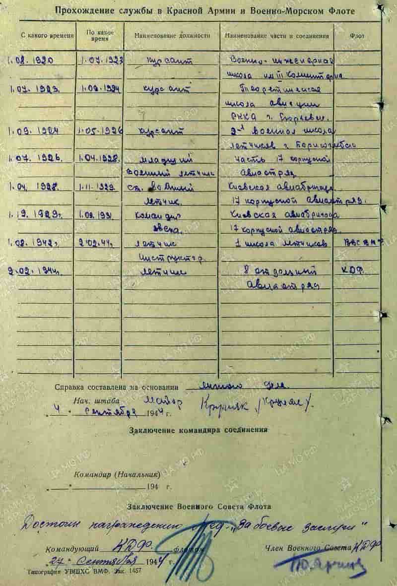 01.09.1924 поступил во 2-ю военную школу лётчиков в г. Борисоглебске, которую окончил 01.05.1926.