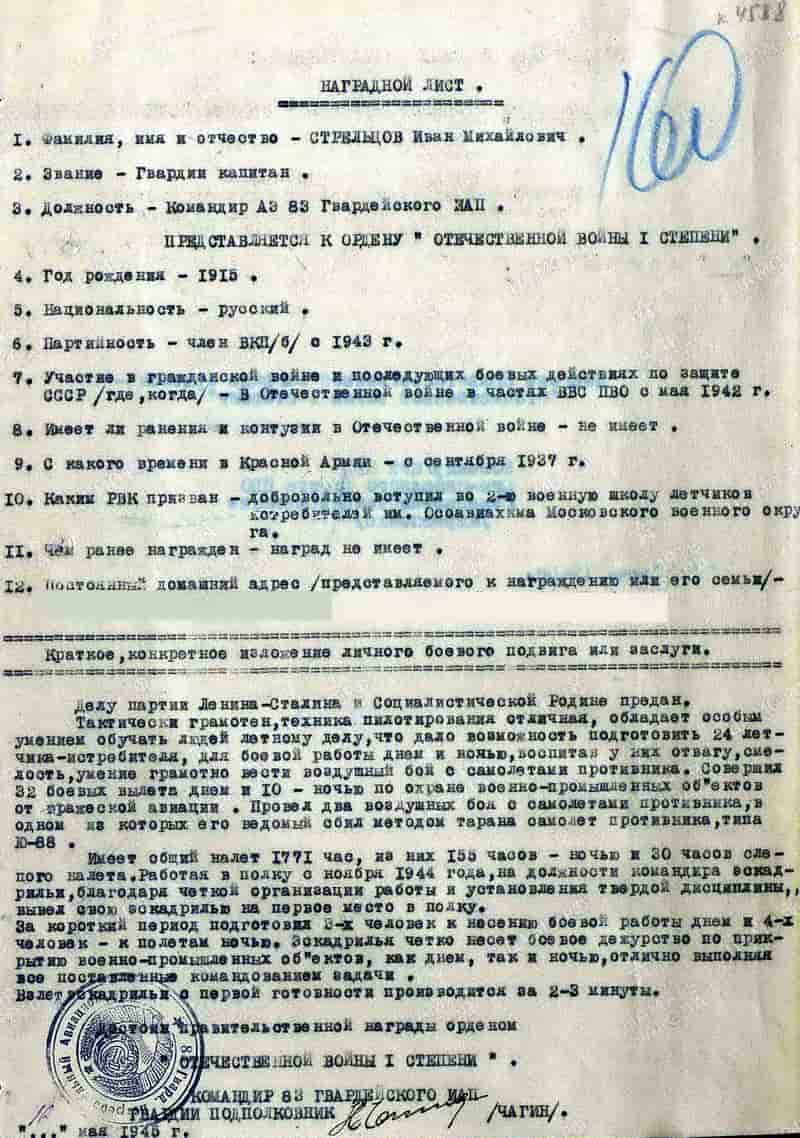 16.05.1945 командир эскадрильи 83 гвардейского иап гвардии капитан Стрельцов И.М. представлен к награждению и 29.06.1945 награждён орденом Отечественной войны I степени.