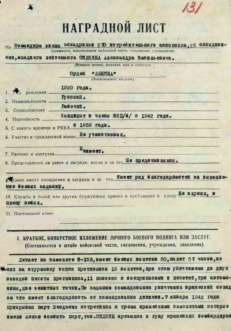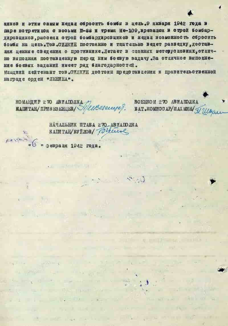 06.02.1942 командир звена 270-го иап ВВС Крымского фронта младший лейтенант Силкин А.В. представлен к награждению и 21.02.1942 награждён орденом Ленина.