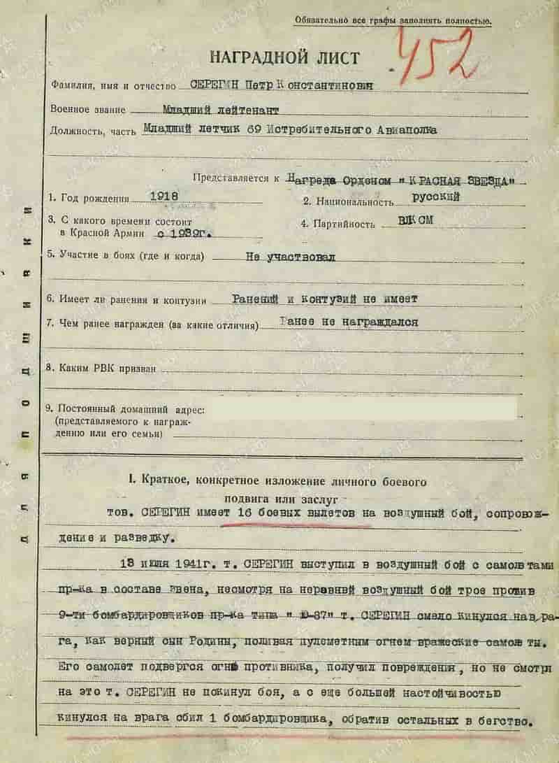 26.07.1941 младший лётчик 69 иад младший лейтенант Серёгин П.К. представлен к награждению.