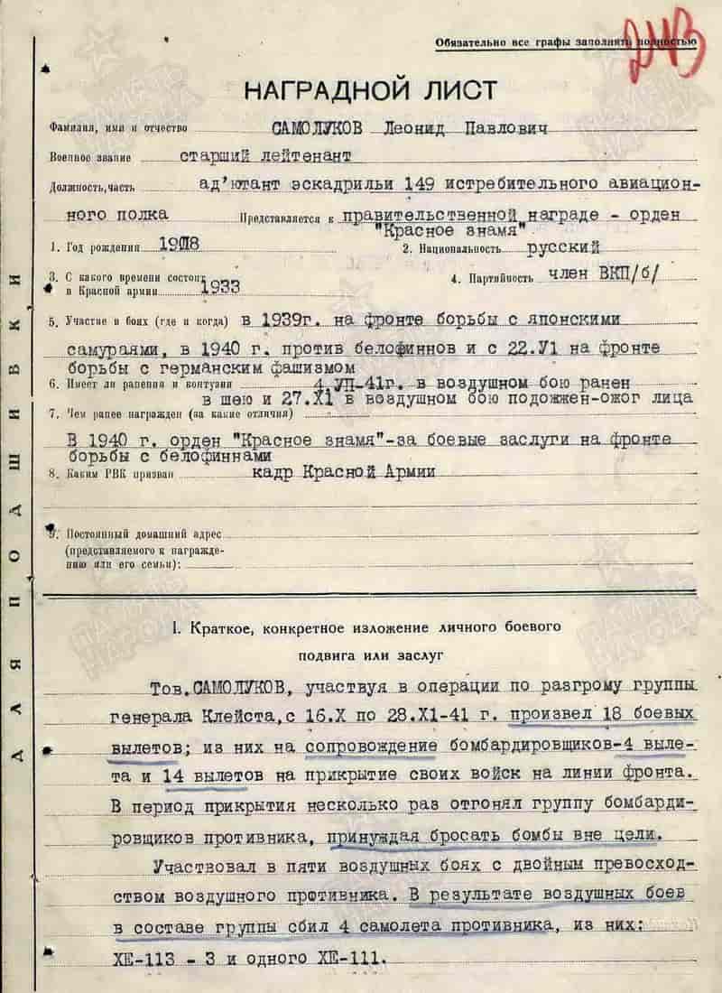 В декабре 1941 года адъютант эскадрильи 149 иап 21 сад ВВС Южного фронта старший лейтенант Самолуков Л.П. представлен к награждению и 23.12.1941 награждён орденом Красного Знамени.