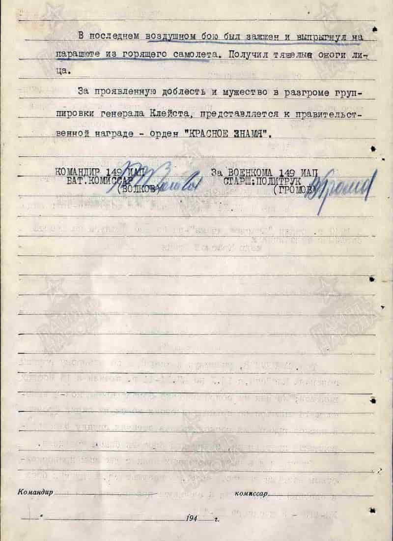 27.11.1941 был сбит в воздушном бою и выпрыгнул из горящего самолёта на парашюте, получил тяжёлые ожоги лица. Проходил лечение в госпитале 1-го ХМИ в г. Харькове и на 05.12.1941 находился в составе 149-го иап 21 сад ВВС Южного фронта.