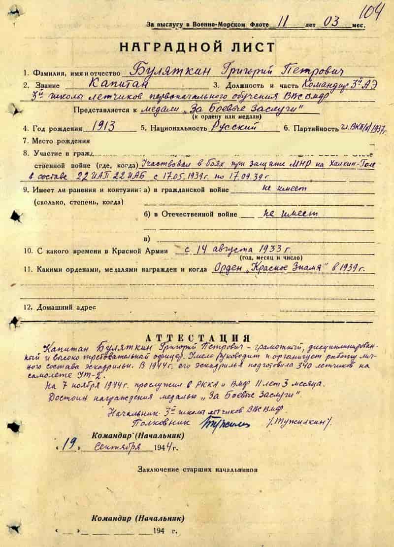 19.09.1944 командир 3-й эскадрильи 3-й ШППО капитан Буляткин Г.П. представлен к награде.