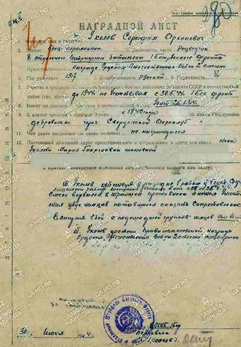 30.06.1944 разведчик 8 ошб 1-го Белорусского фронта боец-переменник Уколов С.А. посмертно представлен к награде.