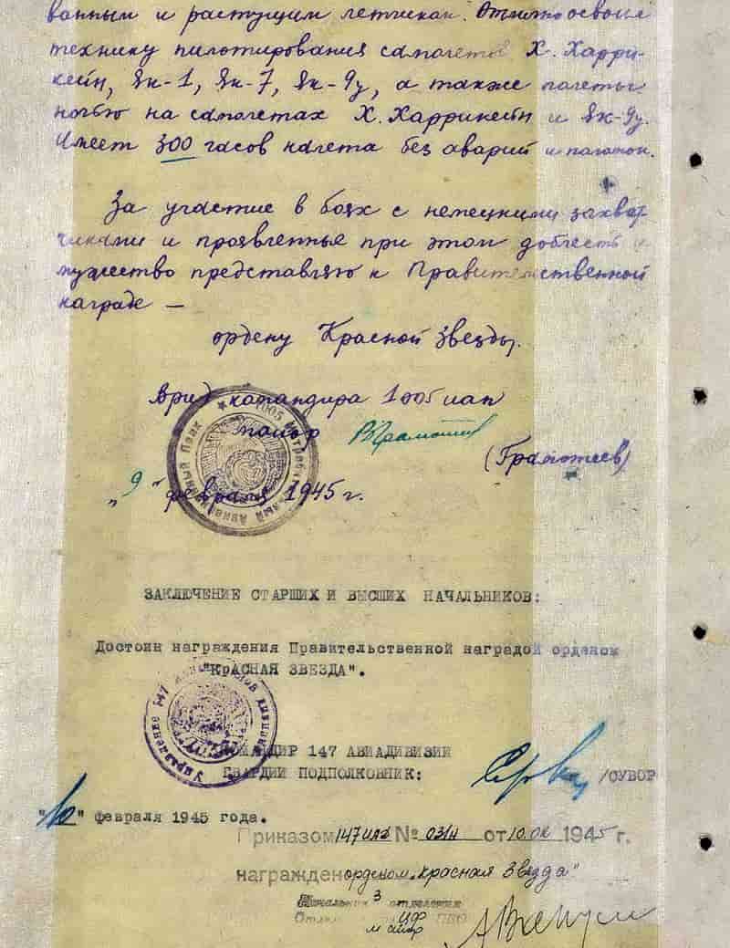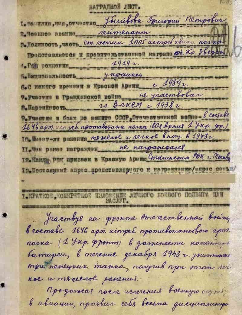 09.02.1945 старший летчик 1005 иап 147 иад ПВО (в оперативном подчинении 80-й дивизии ПВО Центрального фронта ПВО) лейтенант Убийвовк Г.П. представлен и 10.02.1945 награждён орденом Красной Звезды. Налёт на самолетах Харрикейн, Як-1, Як-7, Як-9у составил 300 часов без аварий и поломок.