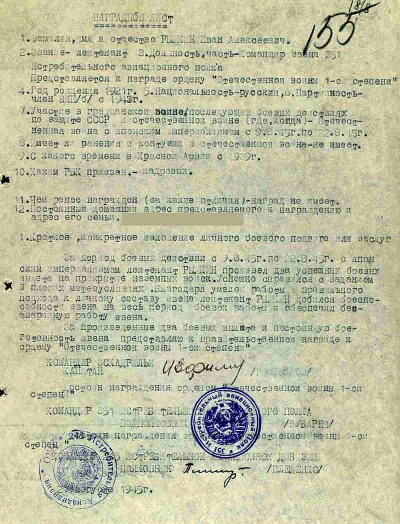 27.08.1945 командир звена 351 иап лейтенант Рыжкин И.А. представлен и 28.08.1945 награждён орденом Отечественной войны I степени.
