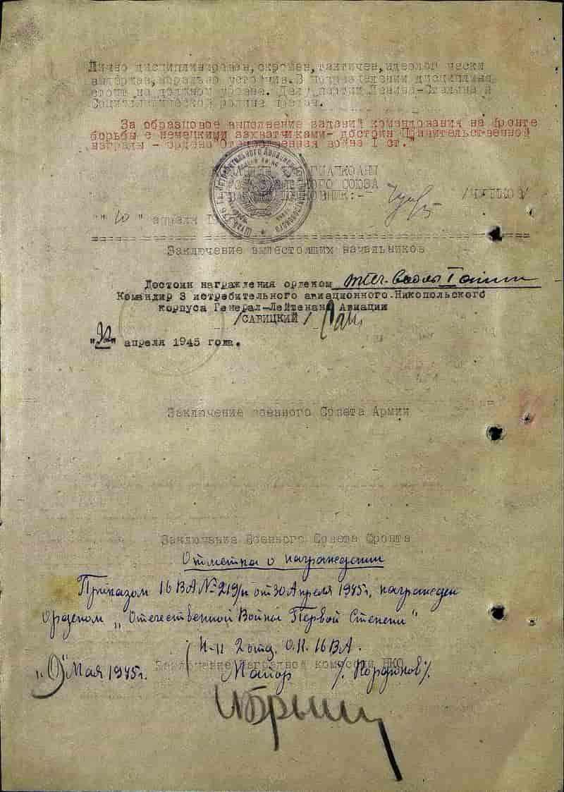 10.04.1945 заместитель командира эскадрильи 176 гвардейского иап гвардии капитан Савин Н.И. представлен к награждению и 30.04.1945 награждён орденом Отечественной войны I степени.
