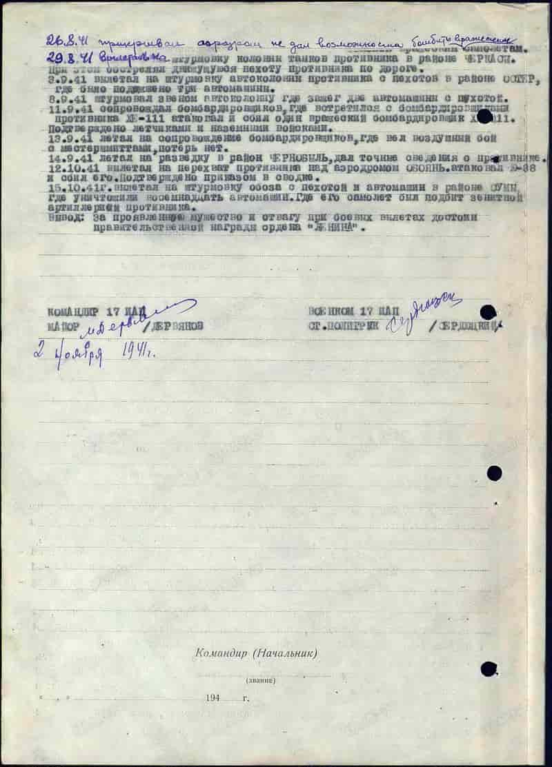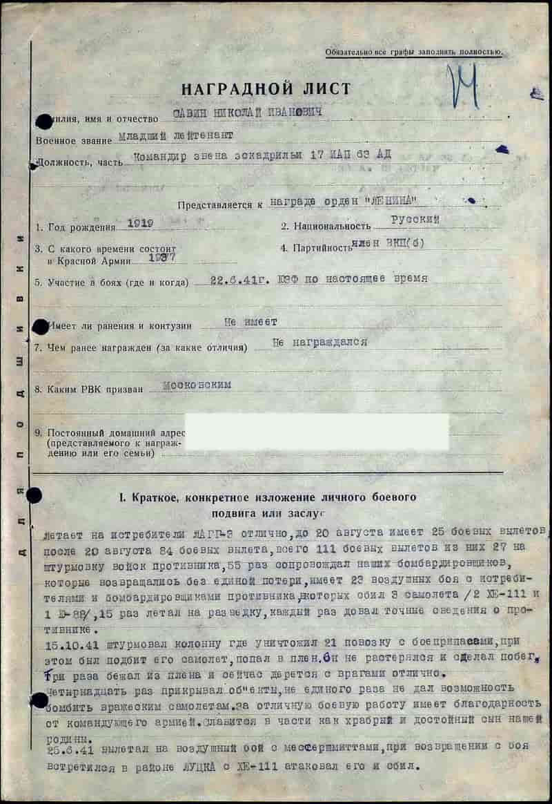 02.11.1941 командир звена 17 иап 63 сад ВВС Юго-Западного фронта младший лейтенант Савин Н.И. представлен и 06.11.1941 награждён орденом Ленина.