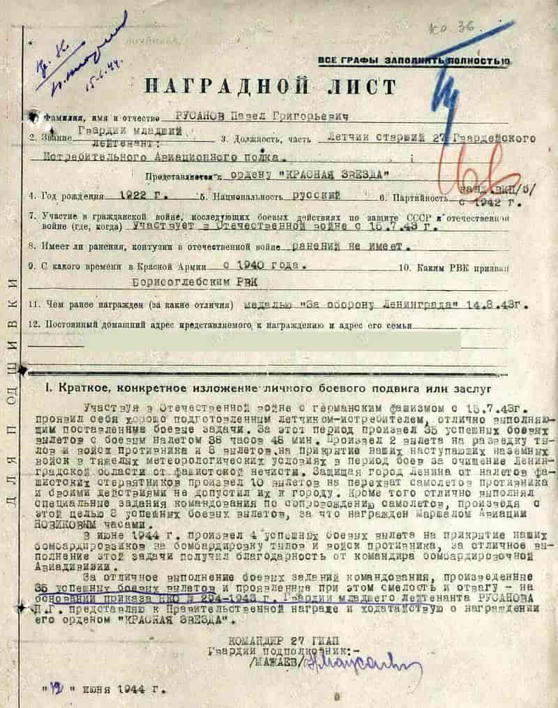 12.06.1944 лётчик старший 27 гиап ПВО гвардии младший лейтенант Русанов П.Г. представлен к награждению и 16.06.1944 награждён орденом Красной Звезды.