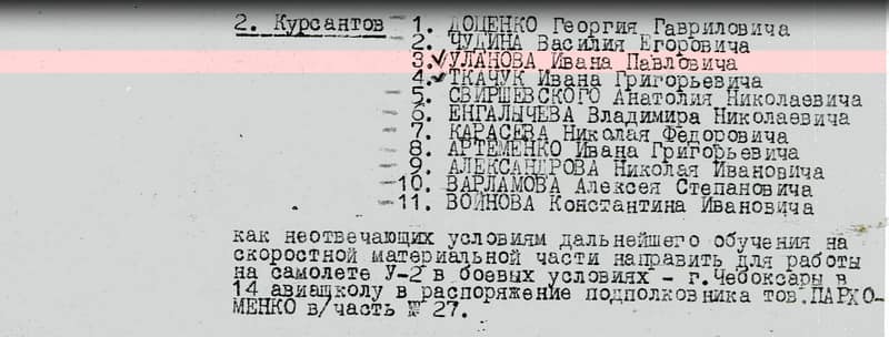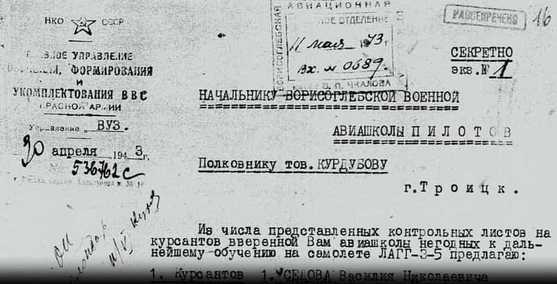 В апреле 1943 года комиссией Борисоглебской ВАШП по своим личным и лётным качествам признан негодным для обучения на самолёте ЛаГГ-3 (исх. № 0536 от 11.04.1943) и направлен в распоряжение подполковника Пархоменко И.А. в 14-ю военную авиационную школу первоначального обучения г. Чебоксары (в/ч № 27) для работы на самолёте У-2 в боевых условиях (исх. № 536762с ГУФУ ВВС КА от 30.04.1943).