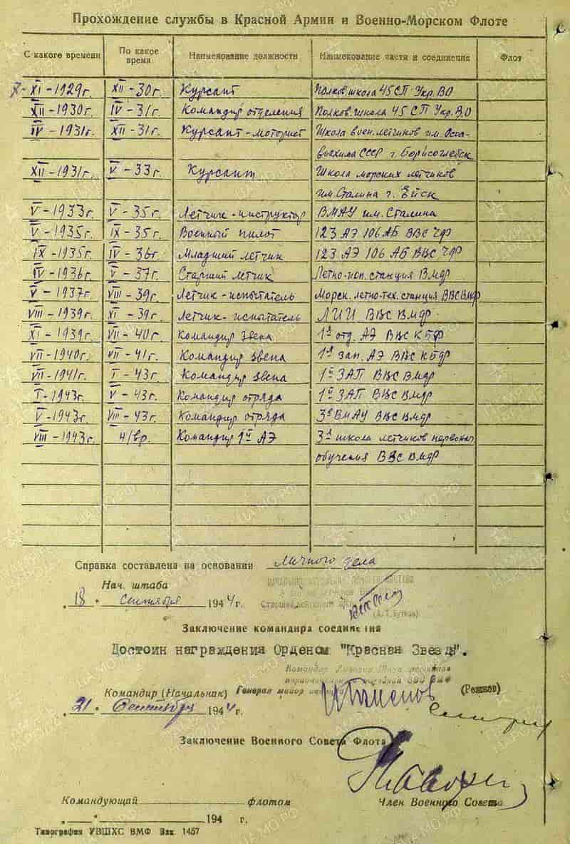 На 18.09.1944 — капитан, командир 1-й эскадрильи 3-й школы пилотов первоначального обучения ВВС ВМФ (по данным наградного листа).