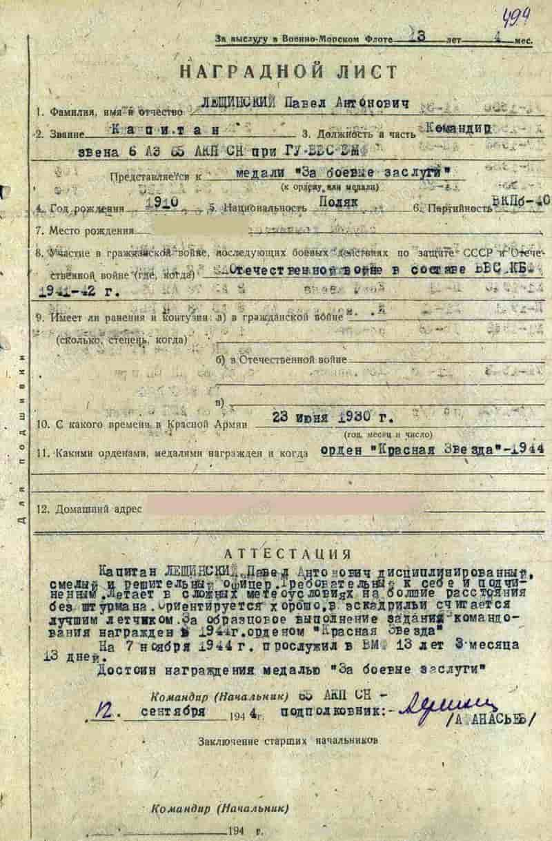 11.09.1944 командир звена 6-й авиационной эскадрильи 65-го истребительного авиационного полка специального назначения при ГУ ВВС ВМФ капитан Лещинский П.А. представлен к награде.