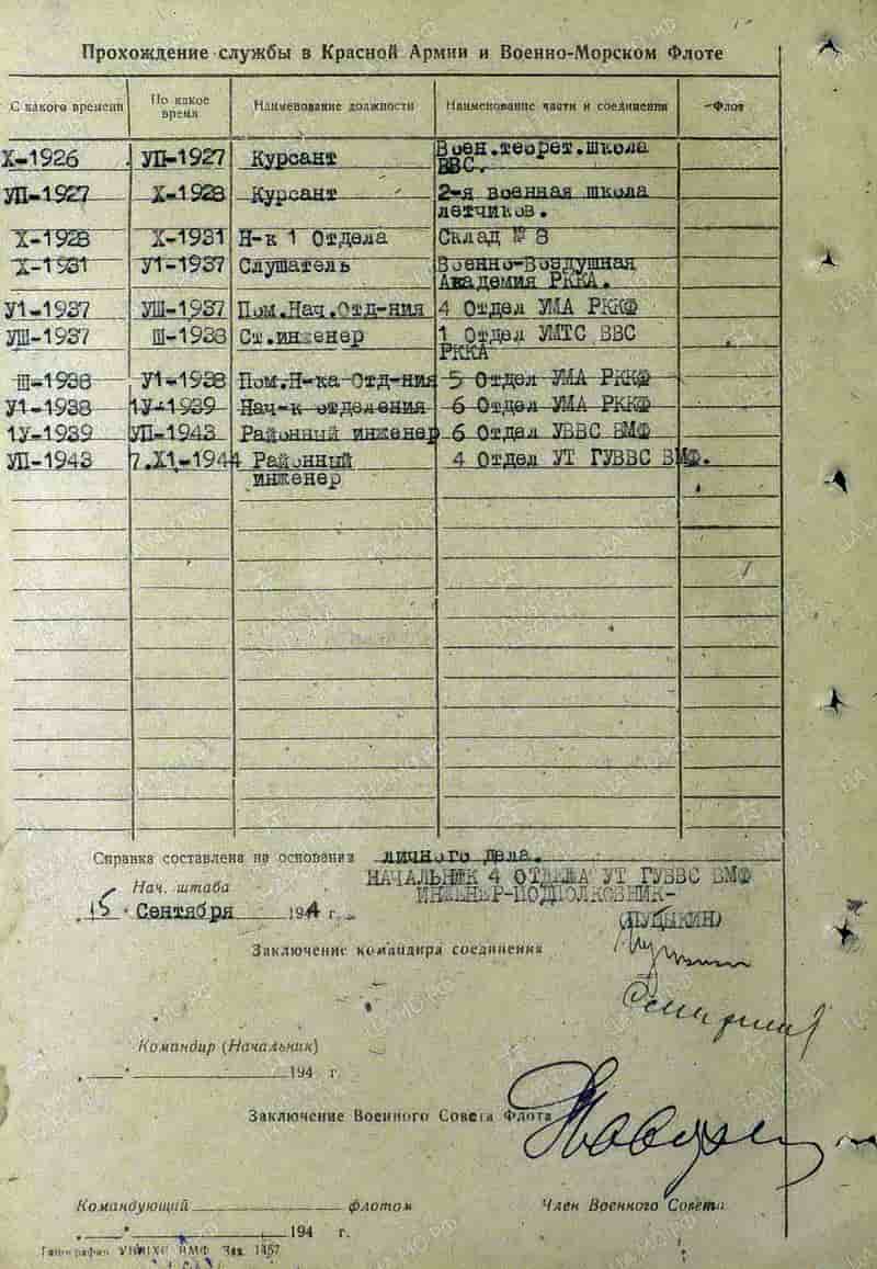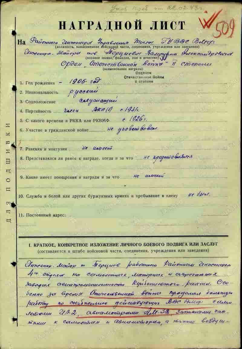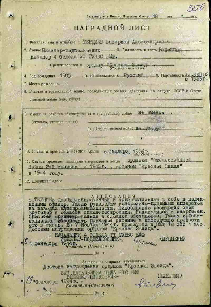15.09.1944 районный инженер 4-го отдела Управления тыла Главного управления ВВС ВМФ инженер-подполковник Терциев В.А. представлен к награде.